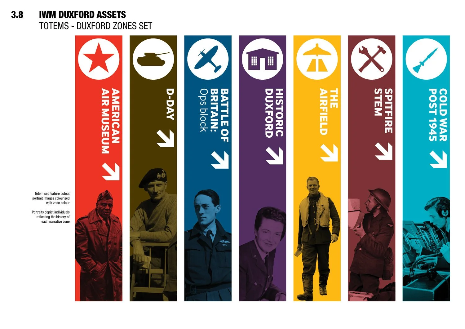 The project involved developing a colour-coded symbol identity and layout system for the large-scale navigational totems used across the huge Duxford site, providing directions between the various exhibition zones.