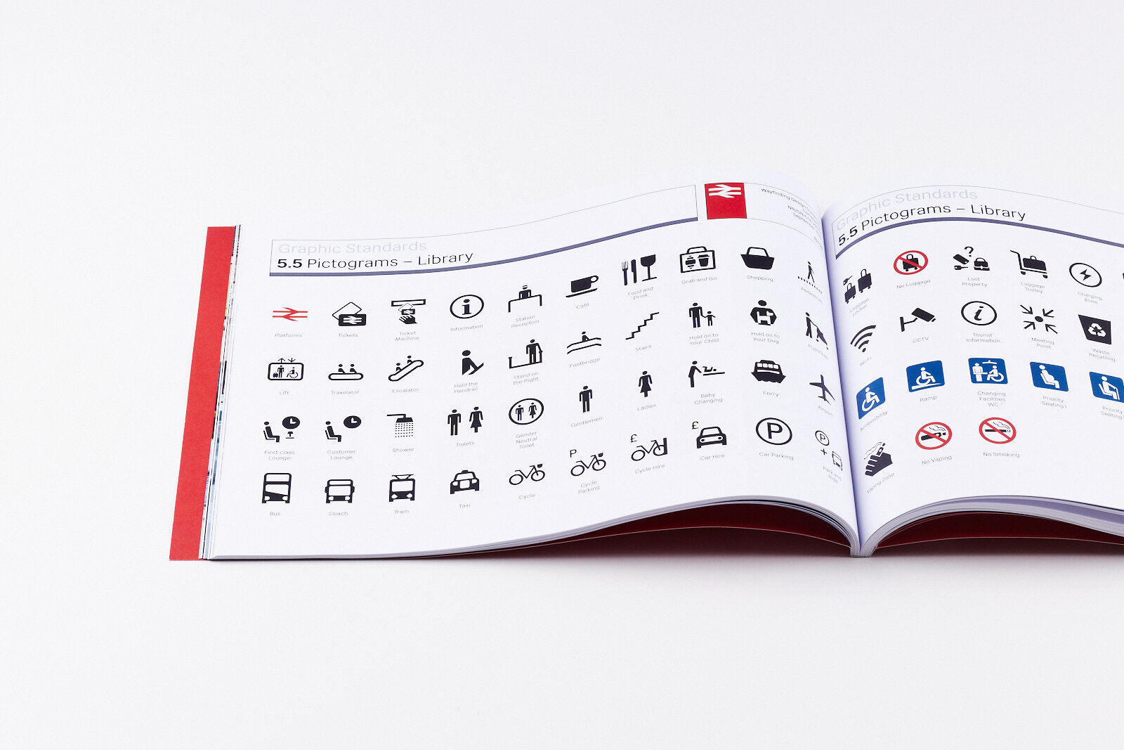 A complete pictogram system covering 85+ icons: transport modes, facilities, accessibility, wayfinding arrows, and operational signage. The system balances international legibility with British character, and connects visually to the Rail Alphabet typographic family.